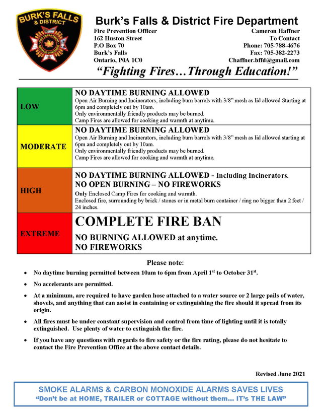 The Ontario government is restricting outdoor fires to ensure the provinces emergency response can focus on the novel coronavirus outbreak. Spring Fire Safety Tips. Day Use Remains Open.